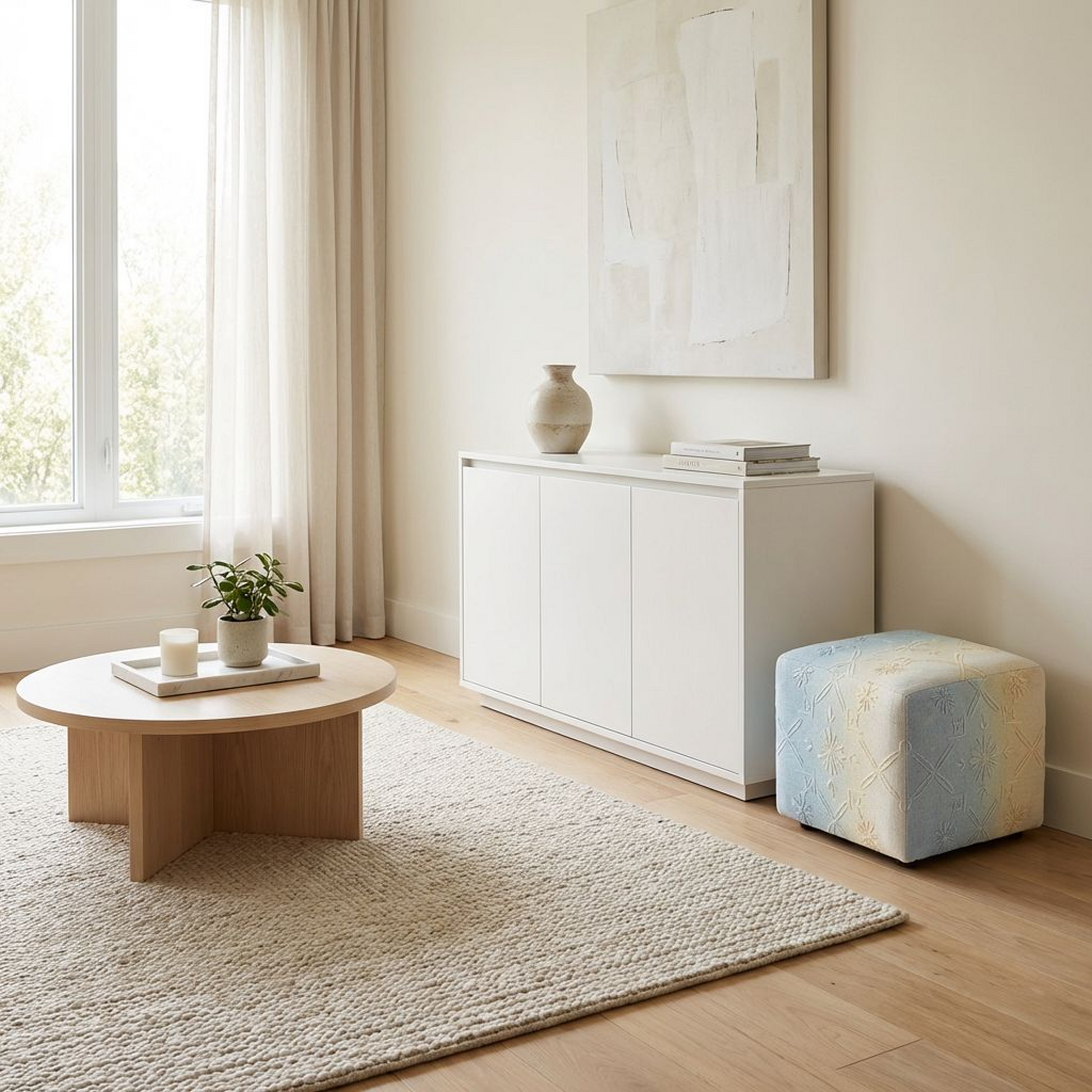 Add an easy pop of texture (and a place to kick your feet up) with this embroidered cube pouf. Wrapped in a soothing blue-to-cream ombré fabric with raised floral-and-geo stitching, it brings cozy charm to living rooms, bedrooms, nurseries, and reading corners. Use it as a footrest, extra seat, or a compact accent piece that instantly warms up a space.